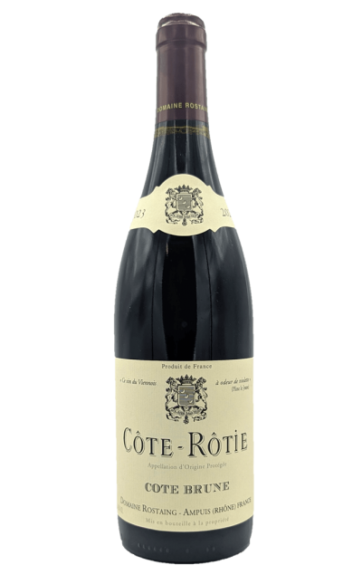 Le Côte-Rôtie « Côte Brune » du domaine René Rostaing provient de parcelles situées sur la partie la plus austère et minérale de l’appellation. Les sols riches en schistes foncés et en oxydes de fer confèrent aux vins une structure puissante et une profondeur remarquable, signature des grandes Côte-Rôtie de garde.